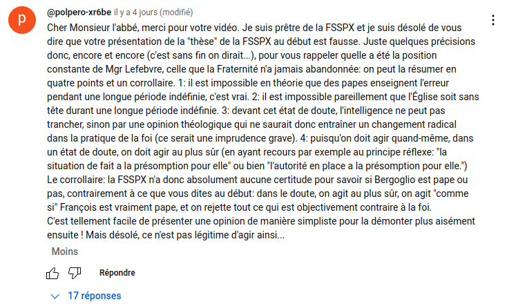 Monsieur l’abbé ‘polpero’ de la FSSPX ayant remercié l’abbé Dutertre de faire avancer le débat doctrinal, nous le remercions à notre tour d’y avoir pris part, et espérons que d’autres prêtres le rejoindront bientôt. Les arguments présentés par l’abbé Dutertre ne sont pas, en effet, quoiqu’il en dise, des « opinions théologiques. » Il s’agit de l’enseignement de l’Eglise sur l’infaillibilité de son magistère: l’infaillibilité du Magistère Ordinaire Universel (qui est de foi, Cf. l’enseignement de Vatican I), l’infaillibilité pratique de la liturgie universelle de l’Eglise (Cf. l’anathème du Concile de Trente à ceux qui disent le contraire), l’infaillibilité des canonisations (Cf. l’enseignement explicite de Pie XI et Pie XII à ce sujet), et ainsi de suite.