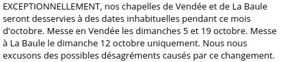 Messe le lundi, mardi, et jeudi à 7h00, le mercredi à 11h15. Se référer aux annonces hebdomadaires.