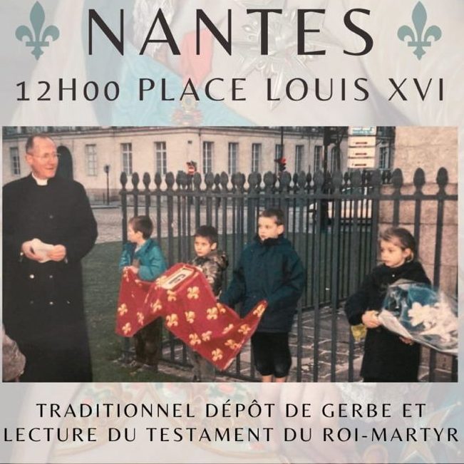 Dans le même esprit et pour que notre témoignage soit public, nous nous retrouvons au pied de la colonne Louis XVI à Nantes pour la lecture du Testament du Roi martyr et le chant en l’honneur des saints français.