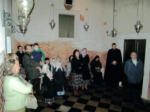 Prière et chant des litanies de Lorette dans la reproduction de la maison de la Sainte Vierge.